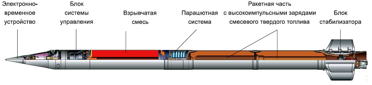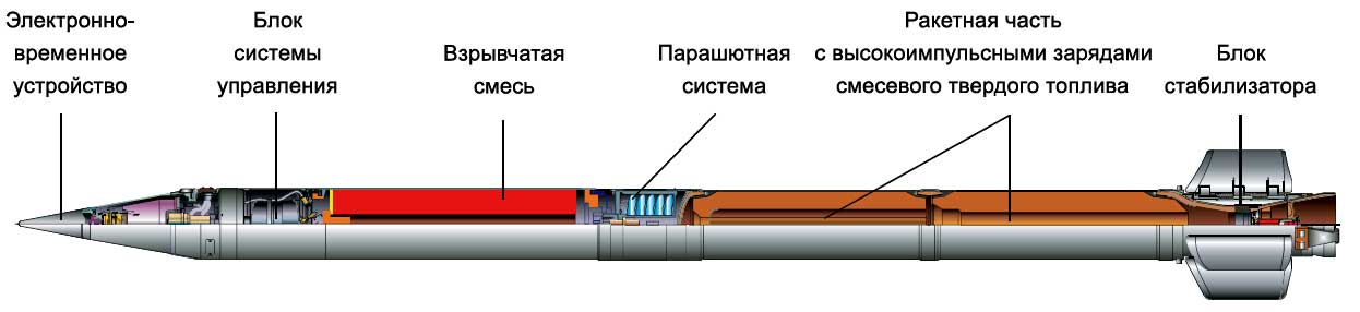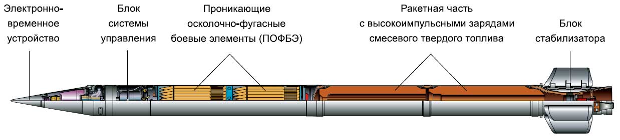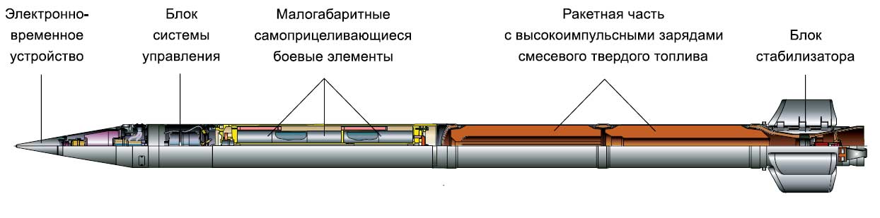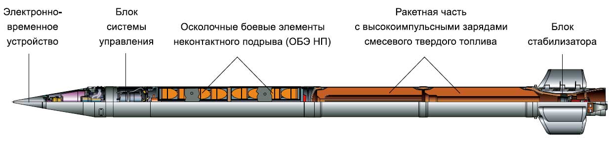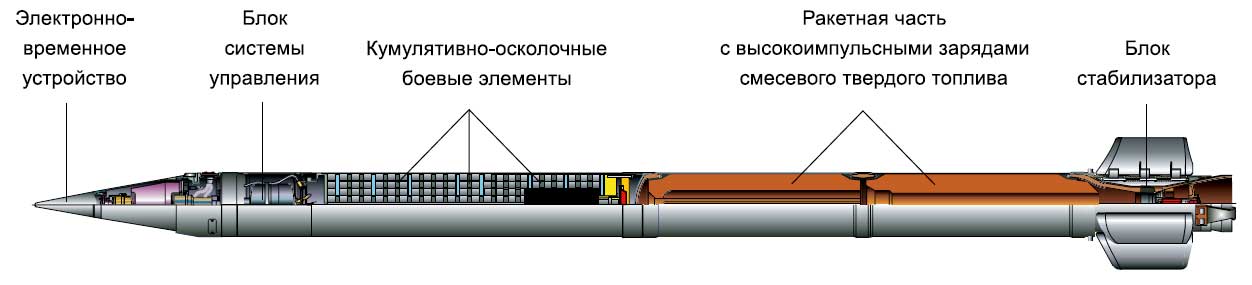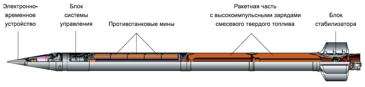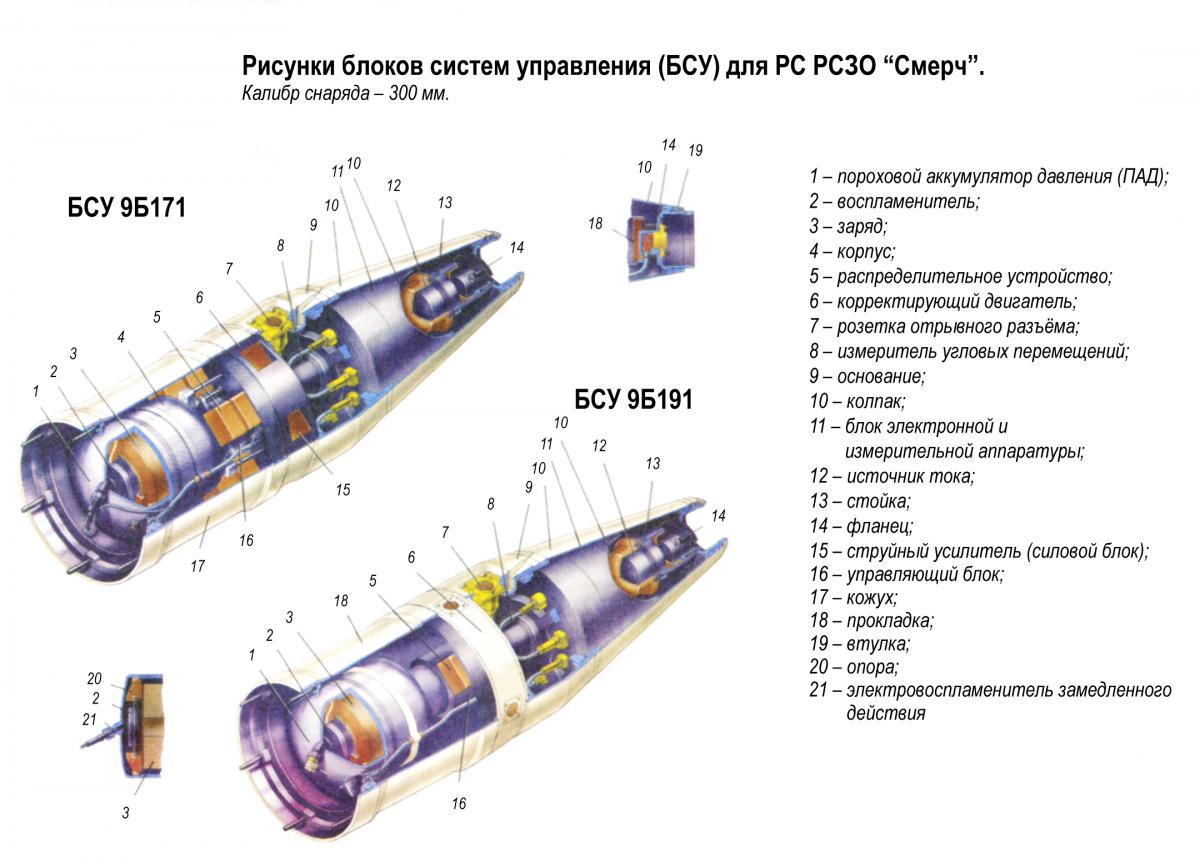 "Raketové střely vyvinuté pro Smerch MLRS mají unikátní konstrukci, která poskytuje přesnost zásahu, která je 2-3krát vyšší než u podobných zahraničních raketových dělostřeleckých systémů. Poprvé byly sovětské raketové dělostřelecké granáty řiditelné. Při jejich návrhu byl použit inerciální řídicí systém, který zajišťuje úhlovou stabilizaci střel v aktivní části trajektorie a korekci dostřelu v důsledku korekce na dobu separace bojové hlavice, určenou palubním zařízením v souladu s naměřeným parametry pohybu střely."