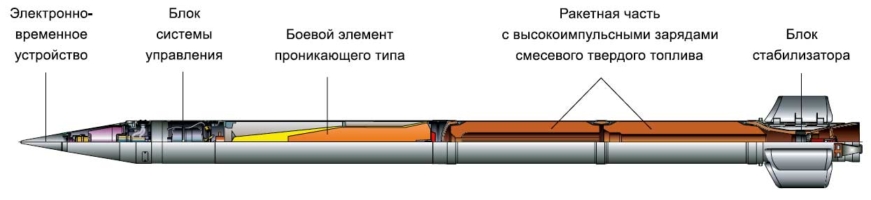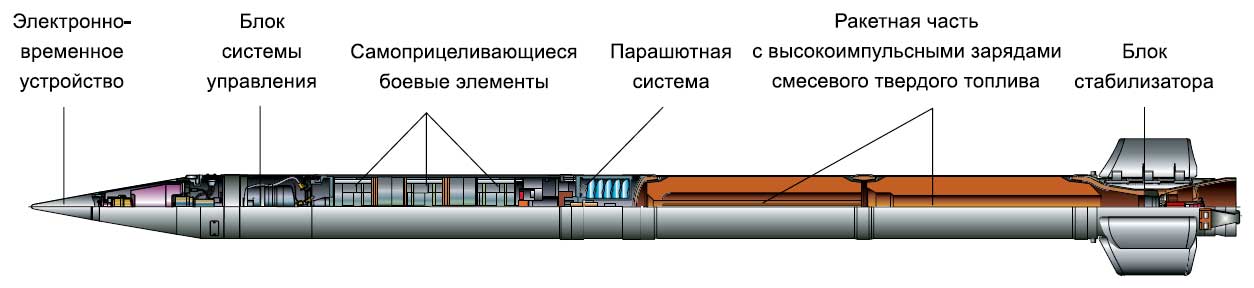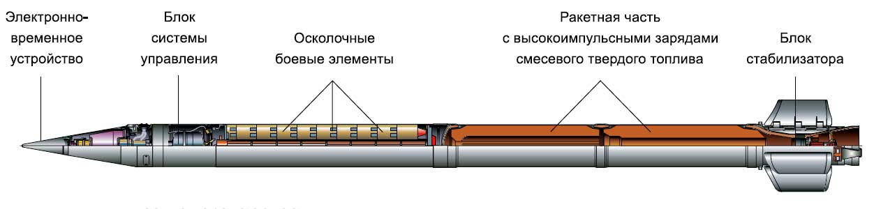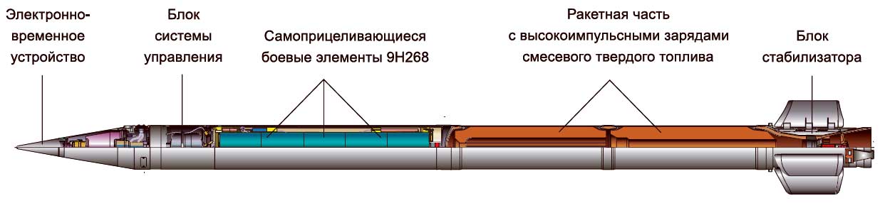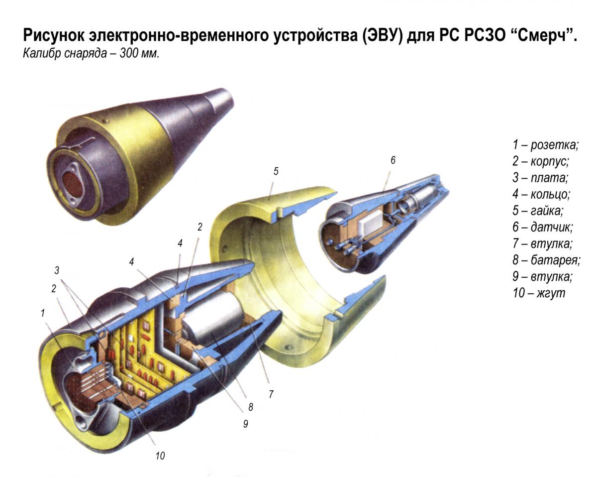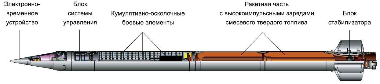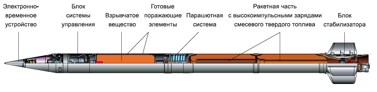 "Raketové střely vyvinuté pro Smerch MLRS mají unikátní konstrukci, která poskytuje přesnost zásahu, která je 2-3krát vyšší než u podobných zahraničních raketových dělostřeleckých systémů. Poprvé byly sovětské raketové dělostřelecké granáty řiditelné. Při jejich návrhu byl použit inerciální řídicí systém, který zajišťuje úhlovou stabilizaci střel v aktivní části trajektorie a korekci dostřelu v důsledku korekce na dobu separace bojové hlavice, určenou palubním zařízením v souladu s naměřeným parametry pohybu střely."
