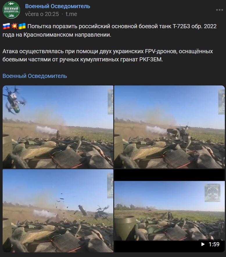 Pokus o zásah ruského hlavného bojového tanku T-72B3 (Т-72Б3) model z roku 2022 (обр. 2022) na Krasnolimanskom smere. Útok sa uskutočnil s pomocou 2 ukrajinských FPV-dronov vybavených hlavicami z ručných kumulatívnych granátov RKG-3EM (РКГ-3ЕМ).