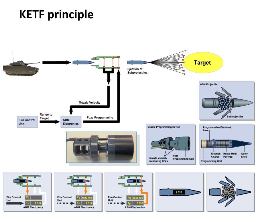 Co si pamatuji. O granátech s dálkově řízenou detonací se psalo v souvislosti s ráží 30mm. Jak dát starým kanonůn 2A42, 2A72 novou účinnost levnou modernizací bez zásahu do konstrukce zbraně, jen novým granátem a přidáním modulu na vozidlo s elektronikou a laserem pro dálkový odpal granátů. A pokud si to pamatuji dobře, tak bez potřeby toho indukčního programovatelnýho nástavce. Mělo to být levné řešení narozdíl od univerzální a drahý programovatelný pro různé mise. Jak jsem to pochopil, tak na dně granátu má být fotodetektor spojený se zapalovačem pro iniciaci po ozáření laserovým paprskem vozidla - nosiče zbraně. Jak to má zjistit přesnou rychlost každého granátu nevím, pravděpodobně nijak a bude se vycházet z průměrné počáteční rychlosti granátu.