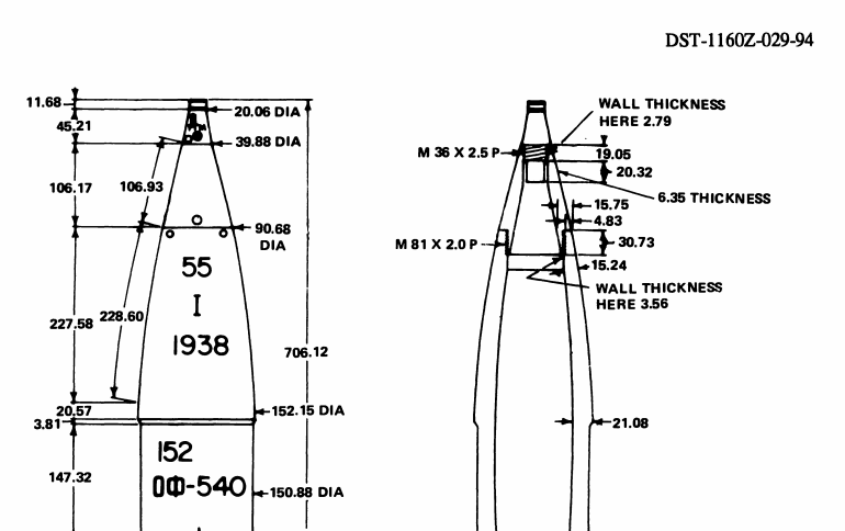 Priemer cez kruzky je 155,45mm( u ruskeho projektilu cal 152mm)