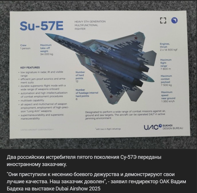 Zdroj https://vk.com/wall-123538639_4744021 z 18.11.20252 ruské lietadlá 5. generácie Suchoj Su-57E (Су-57Э) boli odovzdané zahraničnému zákazníkovi.