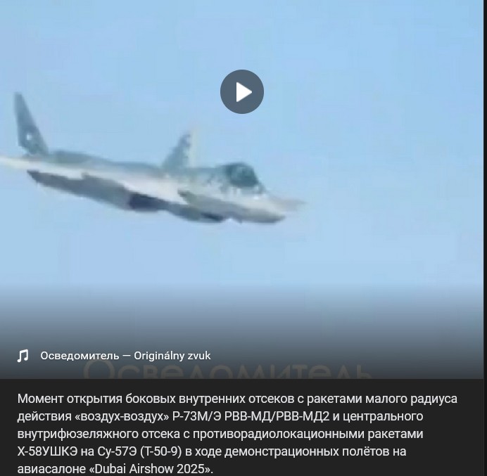 Video https://vk.com/clip-123538639_456319621Spomalený Moment otvorenia bočných vnútorných priestorov s raketami malého dosahu „vzduch-vzduch“ R-73M/E (Р-73М/Э) / RVV-MD/RVV-MD2 (РВВ-МД/РВВ-МД2) a centrálneho vnútorného priestoru trupu s protiradarovými raketami Ch-58UŠKE (Х-58УШКЭ) na lietadle Suchoj Su-57E (Су-57Э) = reálne Т-50-9, počas demonštračných letov na leteckom veľtrhu „Dubai Airshow 2025“.