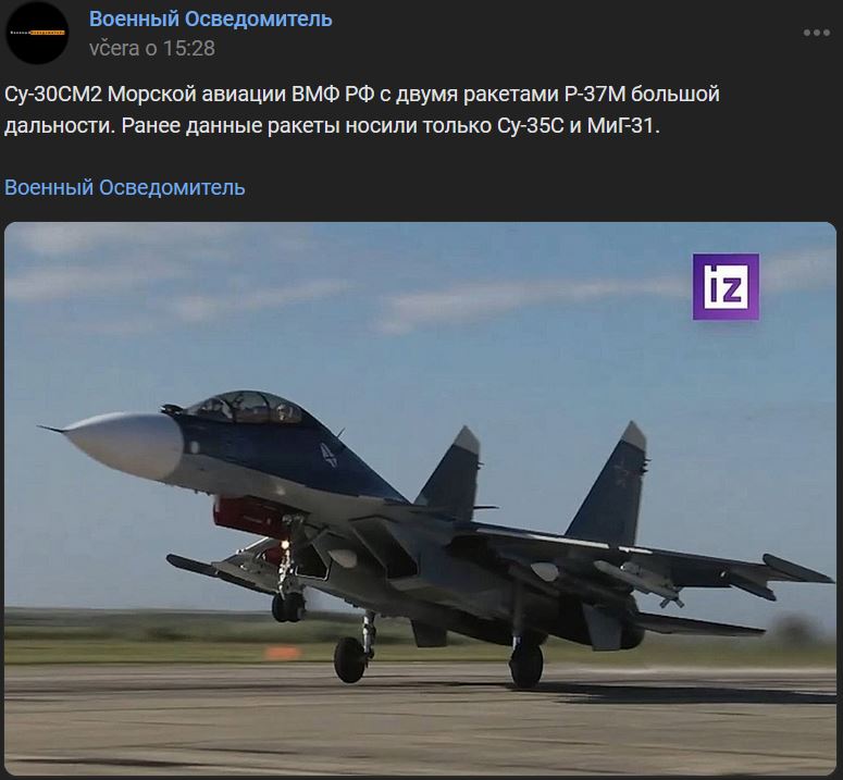 Su-30SM2 (Су-30СМ2) námorného letectva VMF RF s 2 raketami dlhého doletu R-37M (Р-37М). Predtým tieto rakety niesli len lietadlá rodiny MiG-31 (МиГ-31) a Su-35S (Су-35С).