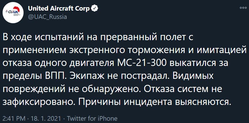 Počas skúšok na prerušený vzlet s použitím núdzového brzdenia a simulovanej poruchy jedného motora sa MS-21-300 vyvalil z vzletovej a pristávacej dráhy (VPD). Posádka nebola zranená. Nenašli sa žiadne viditeľné poškodenia. Neboli zaznamenané žiadne poruchy systému. Príčiny incidentu sa vyšetrujú.В ходе испытаний на прерванный полет с применением экстренного торможения и имитацией отказа одного двигателя МС-21-300 выкатился за пределы ВПП. Экипаж не пострадал. Видимых повреждений не обнаружено. Отказа систем не зафиксировано. Причины инцидента выясняются.