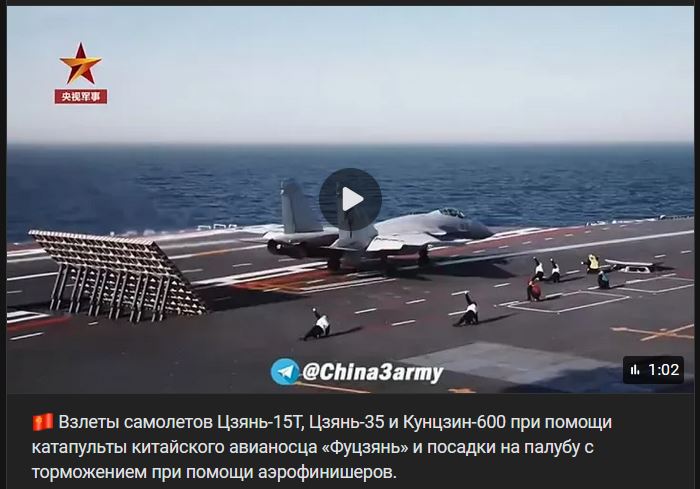 Vzlety lietadiel Jian-15T, Jian-35 a Kunjing-600 pomocou katapultu z čínskej lietadlovej lode „Fujian“ a pristátia na palube s brzdením pomocou aerofinišerov.