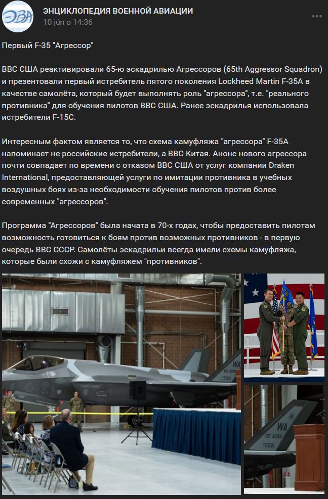 USAF reaktivovalo 65. letku agresorov (65th Aggressor Squadron) a predstavilo prvé stíhacie lietadlo 5. generácie Lockheed Martin F-35A v úlohe ako "agresor", t. j. lietadlo "skutočného nepriateľa", ktoré má slúžiť na výcvik pilotov USAF. Predtým letka používala lietadlá F-15C. Zaujímavosťou je, že kamufláž "agresora" F-35A sa nepodobá na kamufláž ruských lietadiel, ale na čínske vzdušné sily. Oznámenie o novom Agresore sa takmer zhoduje s tým, že USAF odmietlo služby súkromnej spoločnosti Draken International v oblasti simulácie nepriateľa pri výcviku vzdušného boja, pretože je potrebné cvičiť pilotov proti modernejším "agresorom". Program Agresorov bol spustený v 70. rokoch minulého storočia s cieľom poskytnúť pilotom možnosť výcviku na boj proti možným protivníkom - predovšetkým sovietskemu letectvu. Lietadlá letky mali vždy kamufláž, ktorá bola podobná kamuflážam "protivníkov". +2 foto: