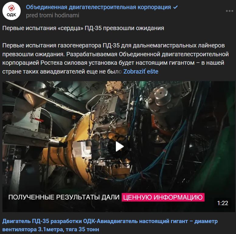 Prvé testy kompresora (газогенератора) leteckého motora PD-35 (ПД-35) pre diaľkové lietadlá prekonali očakávania. Letecký motor, ktorý vyvíja ODK korporácie Rostech, bude skutočným gigantom - takéto letecké motory naša krajina ešte nikdy nemala. Jeho priemer ventilátora je 3,1 metra a ťah 35 ton. Počas testov sa simulovala činnosť motora plnej veľkosti. Na tento účel špecialisti CIAM (ЦИАМ) vytvorili unikátne zariadenie a softvér na skúšobnej stolici. Získané parametre sú v dobrej zhode s konštrukčnými údajmi. Vývojárom motora poskytli cenné informácie a rozsiahle skúsenosti, ktoré sa využijú v priebehu ďalších prác.
