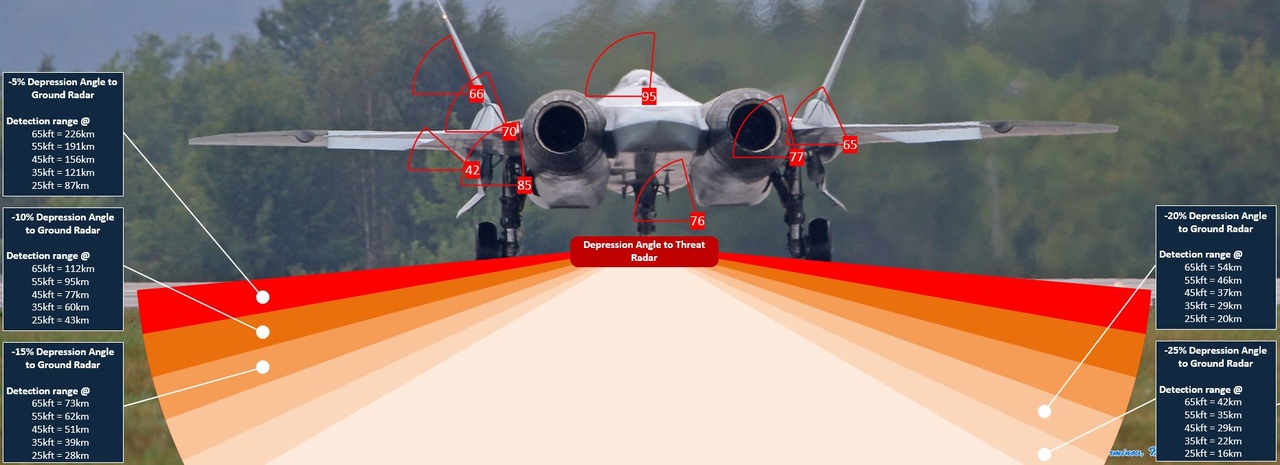 Sledovat až 30 vzdušných cílů umí už Irbis-E a ten žádné boční radary nemá, to by znamenalo, že N036 je jen jeho kopie, což je dost nepravděpodobné, pokud by byla nebyl by potřebný defakto žádný vývoj.. i když z něho evidentně vychází a používá dost podobnou architekturu a T/R moduly. Pak by ty boční radary museli umět sledovat každý až 16 vzdušných cílů, tak aby se to dostalo na až 62 současně sledovaných vzdušných cílů papírově udávaný pro celý radarový komplex S121, a podle počtů T/R modulů se dá zpětně dopočítat, že hlavní radar se stejnými T/R moduly jak v bočních AESA anténách by měl umožňovat sledovat ne až 30 vzdušných cílů ale teoreticky až 65 v režimu jak ty boční radary (což bude pravděpodobně režim s dálkově omezeným dosahem, více současně pracujících radarových svazků v různých směrech), samozřejmě ty boční radary nemohou mít tak velký dosah jak hlavní AESA anténa, co má 4.3x víc T/R modulů, ale čistě teoreticky by měla umožňovat sledovat až 65 vzdušných cílů do vzdálenosti dejme tomu 100-150km, jestli se to používá je otázka druhá, ale čistě teoreticky by to mělo být možné, až 30 vzdušných cílů současně je pravděpodobně parametr pro max. dálkový dosah nad 400km hlavního radaru N036, kdy už se z podstaty věci musí koncentrovat více T/R modulů a není k dispozici tolik vyzařovacích svazků, ale na menších vzdálenostech to může být klidně až těch 65 cílů hlavního radaru, + s bočními radary to dělá současně celkem kolem 92-94 vzdušných cílů, teoreticky to možné je, jestli se to reálně používá je věc druhá. Takticky by to využitelné určitě bylo, kdy třeba jeden letoun z roje vysílá hlavním radarem v režimu jak ty boční se sníženým dálkovým dosahem, ale dokáže současně sledovat do cca 100 vzdušných cílů do vzdálenosti 100-150km a následně to distribuuje na další letouny přes taktický datalink či dál, třeba při sledování/zneškodňování velkého počtu útočících střel s plochou dráhou letu (stovek kusů) by to jistě využití našlo, protože by se trajektorie jejich letu mohli posílat přes datalinky i na PVO a ta by si mohla připravit efektivnější obranu, když by znala trajektorie většiny střel a počty blížící se realitě.