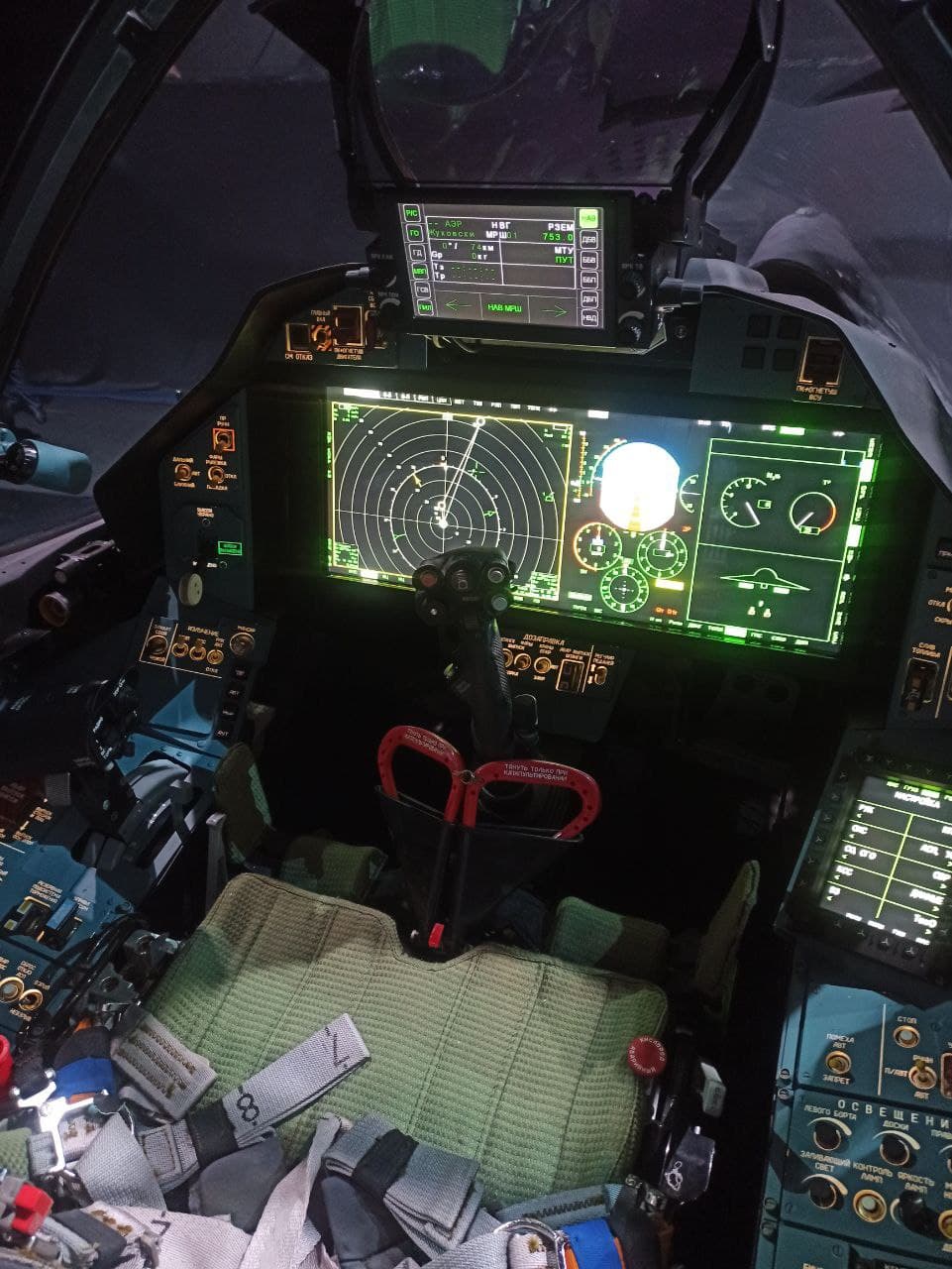 Kokpit - dá se docela s jistotou předpokládat, že takto teď vypadá sériový kokpit Su-57, kdy to má i stejný širokoúhlý HUD a jeden velký LCD displej (možná o trochu zmenšený) místo dvou, ještě ten malý displej na HUDu je o trochu větší a asi to ještě přepracovali - viz.