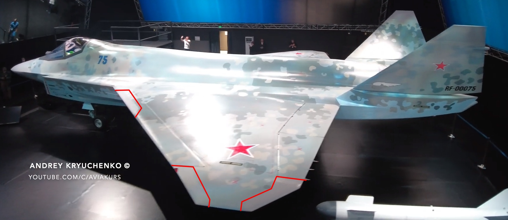 Pokud je to křídlo vážně identické, tak křídla pro prototypy už mají, prostě si je odmontují z prototypů Su-57, k tomu to vypadá, že příď je taky rozměry stejná s tou na Su-57 na mm, jen je tam jiný tvar dielektrického krytu radaru, který je zahnutý dolů, kdežto na Su-57 nahoru. Pak to stavění létajících prototypů může být docela rychlé, první už mají říká zástupce šéfkonstruktéra a ten byl vystaven (pravděpodobně ve variantě Integrovaný zkušební stend (KNS) pro pozemní zkoušky alias druhý neletový prototyp T-75-KNS), jen ještě není připraven a zcela dostavěn na let, což znamená, že ho asi využijí i jako první letový prototyp T-75-1, když říká, že ten vystavený poletí.. K tomu do roka podle jeho slov mají skončit statické testy, tedy mají i první neletový prototyp T-75-0 co už lámou.