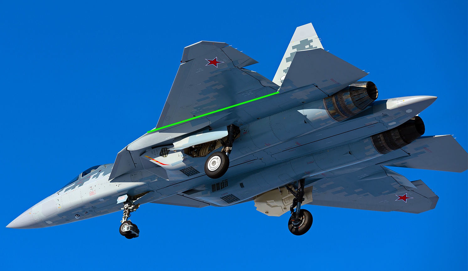 Dokonce bych si dovolil tvrdit, že to křídlo je identické s tím na Su-57 (jestli rozměry, to chce prověřit, ale mohlo by být) - stejné tvary, stejné tvary náběžné hrany a ovládacích prvků křídel, stejný počet a rozmístění 3ks vybíječů statické elektřiny na koncích křídel.