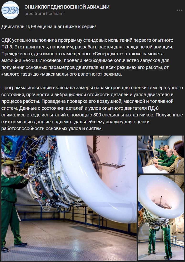 Spoločnosť ODK (ОДК) úspešne ukončila program skúšobných testov prvého prototypu PD-8 (ПД-8). Radi by sme vám pripomenuli, že tento motor sa vyvíja pre civilné letectvo. Hlavne pre Suchoj SuperJet 100 (dovážané komponenty nahrádzané domácimi) a obojživelné lietadlo rodiny Beriev Be-200 (Бе-200). Inžinieri vykonali potrebný počet štartov, aby získali základné parametre motora vo všetkých režimoch jeho prevádzky. Ďalej sa plánujú letové skúšky na lietajúcom laboratóriu Iľjušin Il-76LL (Ил-76ЛЛ)