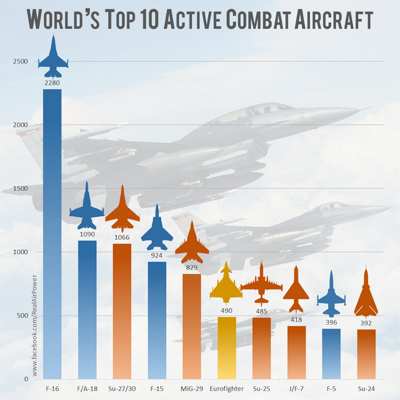 a graf najpoužívanejších základných typov lietadiel vo vojenských letectvách na svete (prvá 10-tka):