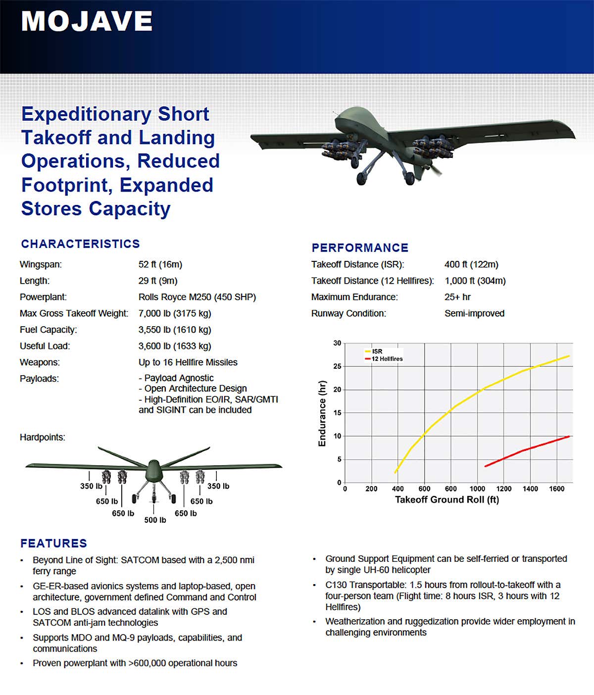 Stejnou cestou se konstruktéři vydali i u "Mojave". Plocha ocasních ploch i jejich rozpětí je mnohem větší než u originálu MQ-1C ... pod trup by se už nevešly.