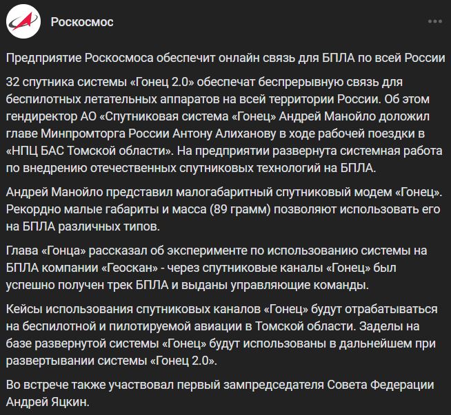 Zdroj https://vk.com/wall-30315369_583485 z 21.03.202532 družíc systému "Gonec 2.0" (Гонец 2.0) bude zabezpečovať nepretržitú komunikáciu / nepretržité spojenie pre bezpilotné lietadlá na celom území Ruska. Informoval o tom generálny riaditeľ spoločnosti AO "Sputnikovaja sistema Gonec" (АО «Спутниковая система «Гонец») Andrej Manoilo (Андрей Манойло) šéfa ruského Ministerstva priemyslu a obchodu Antona Alichanova (Антон Андреевич Алиханов) počas jeho pracovnej návštevy vo výskumnom a vývojovom centre BAS v Tomskej oblasti (НПЦ БАС Томской области). Podnik urýchlil práce na zavádzaní domácich satelitných technológií na BPLA. Andrej Manoilo predstavil malorozmerný družicový modem „Gonec“. Rekordne malé rozmery a hmotnosť (89 gramov) umožňujú jeho použitie na BPLA rôznych typov. Šéf spoločnosti „Gonec“ porozprával o experimente s použitím systému na BPLA spoločnosti „Geoskan“ (Геоскан) - cez družicové kanály "Gonec" bola úspešne sledované / určená letová dráha / trasa BPLA a boli vydané riadiace príkazy. Prípady používania satelitných kanálov „Gonec“ sa budú praktizovať na bezpilotnom a pilotovanom letectve v Tomskej oblasti. Základné poznatky na základe nasadeného systému "Gonec" sa využijú v budúcnosti pri nasadzovaní systému "Gonec 2.0". Na stretnutí sa zúčastnil aj prvý podpredseda Rady federácie Andrej Jackin (Андрей Яцкин).