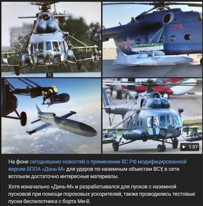 V súvislosti s dnešnými (štvrtok 29.05.2025) správami o tom, že VS RF používajú upravenú verziu BPLA Daň-M (Дань-М) na údery na pozemné objekty VSU, sa na internete objavilo niekoľko pomerne zaujímavých materiálov. Hoci bol Daň-M (Дань-M) pôvodne navrhnutý na vypúšťanie z pozemného odpaľovacieho zariadenia pomocou raketových urýchľovačov, uskutočnili sa aj skúšobné vypustenia bezpilotnika z vrtuľníka rodiny Miľ Mi-8 (Ми-8).