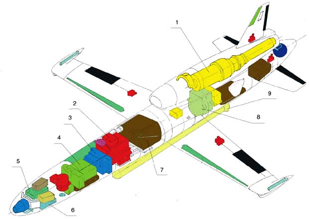 Zelené kliny v nábežných hranách krídla sú zrejme kútové odražače, tmavomodrá guľa na konci trupu je zrejme luneburgova šošovka
