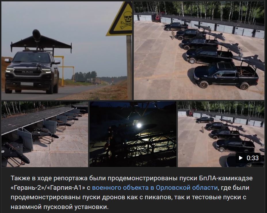 V relácii tiež ukázali štarty BPLA Geraň-2 (Герань-2) / Garpia-A1 (Гарпия-А1) z vojenského zariadenia v Orlovskej oblasti, kde boli demonštrované štarty dronov z pickupov aj skúšobné štarty z pozemného odpaľovacieho zariadenia.