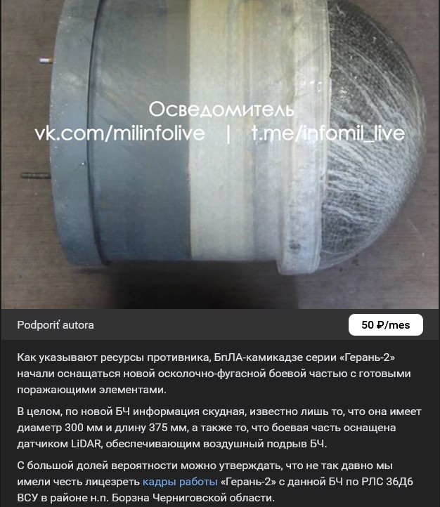 Ako uvádzajú zdroje nepriateľa, BPLA-kamikadze série „Geraň-2“ (Герань-2) začali byť vybavené novou trieštivo‑trhavou (fragmentačno‑trhavá) bojovou časť s predformovanými (hotovými) účinnými prvkami / fragmentmi / elementami.