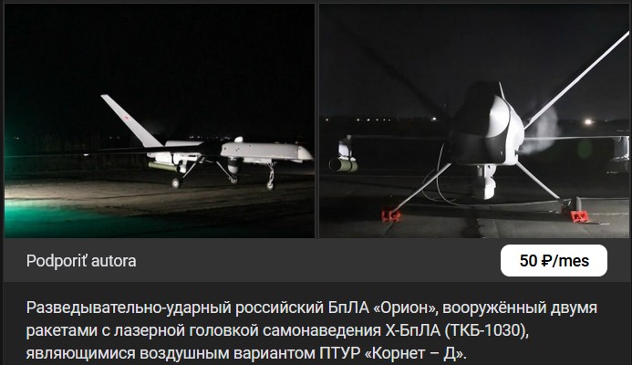 Prieskumno-bojový ruský BPLA „Orion“ (Орион), vyzbrojený 2 raketami s laserovou navádzacou hlavicou X-BpLA (TKB-1030/ТКБ-1030), ktoré sú vzdušnou verziou protitankovej riadenej strely „Kornet–D“ (Корнет–Д).