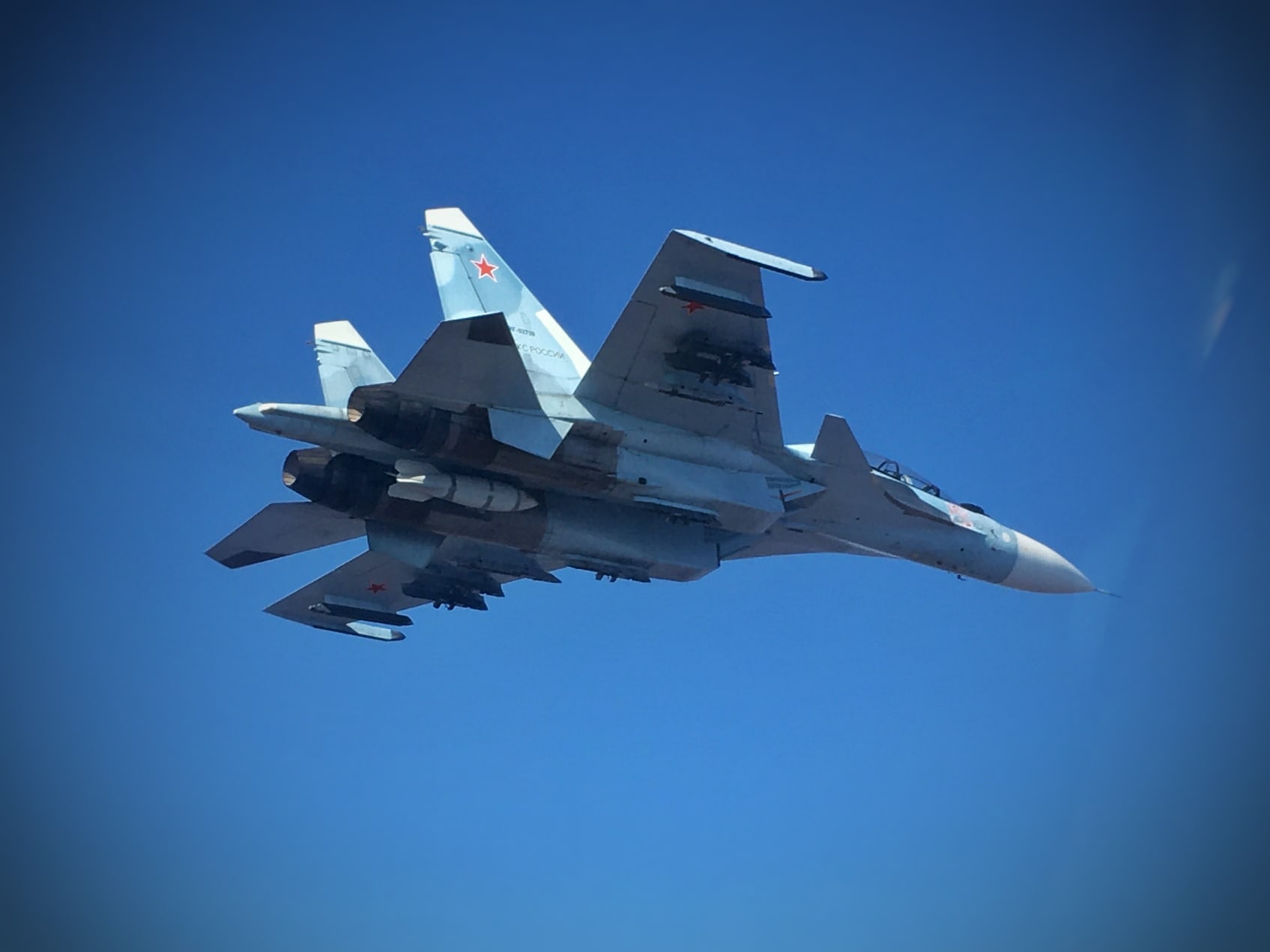 Lietadlo Suchoj Su-30SM (Су-30см) s podvesenou "imitačnou" bombou IAB-500 (ИАБ-500) ktorá imituje ruskú A-bombu izd. 244N (244Н)/RN-24 (РН-24)