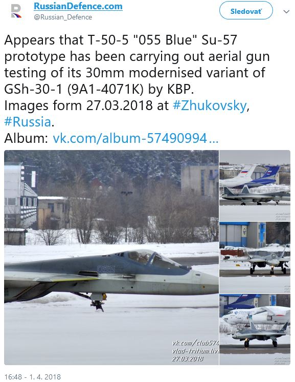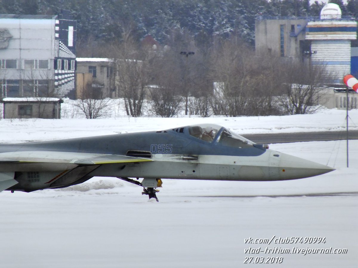 T-50, registrácia 055 po testovaní palubného 30mm kanóna, foto zo dňa 27.03.2018: