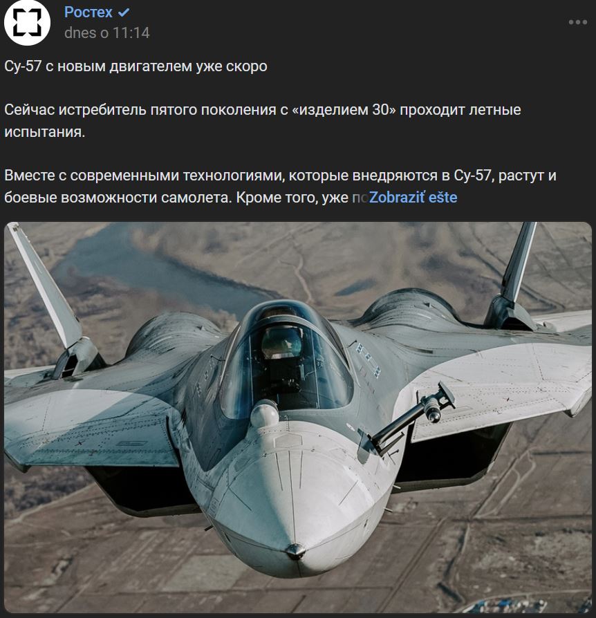 Teraz lietadlo 5. generácie s motorom "Výrobok 30" (Изделие 30 / Izdelije 30) prechádza letovými skúškami... Okrem toho Rostech (Ростех) začne dodávať stroje s motorom druhej etapy už v rámci existujúcej zmluvy. Zdroj https://vk.com/wall-47275428_287126 z 14.11.2023