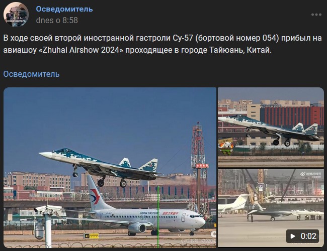 Počas svojho 2. zahraničného turné Suchoj Su-57 (letové číslo 054) dorazil na letecký veľtrh "Zhuhai Airshow 2024" v čínskom meste Taiyuan.