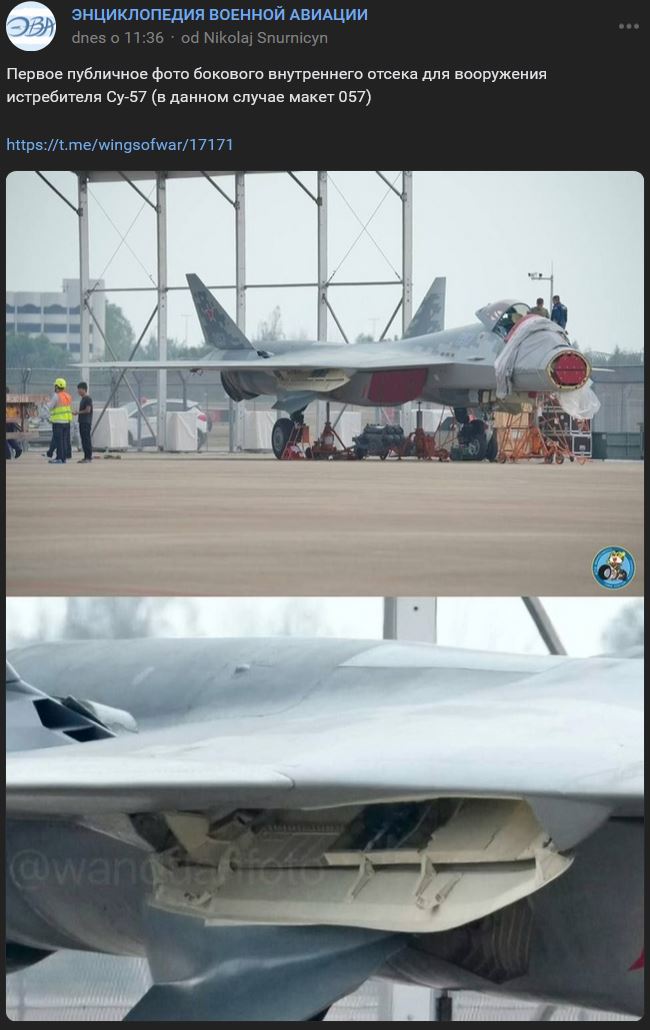 Prvá zverejnená / verejná fotografia bočného vnútorného priestoru výzbroje lietadla Suchoj Su-57 (Су-57), presnejšie neletovej makety 057, bez výzbroje / katapultu.