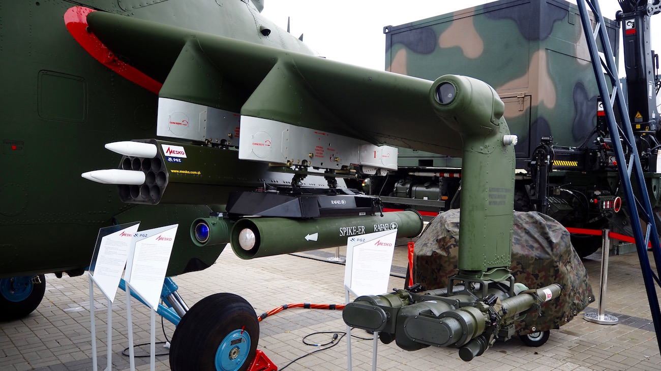 Poľsko podpísalo zmluvu s izraelskou firmou Rafael na modernizáciu elektro-optického navádzacieho a zameriavacieho systému pre svoje bojové vrtuľníky rodiny Mil Mi-24 zaradené v Poľskej armáde. Po inštalácii optiky "Toplite" od firmy Rafael budú poľské Mi-24 vyzbrojené raketami Spike-LR ktoré sa licenčne vyrábajú v Poľsku. Uvedený optický systém sa už v Poľsku využíva na vrtuľníkoch W-3PL Głuszec. Foto z výstavy - ako by to malo vypadať po modernizácii = neriadené 70mm rakety + riadené protizemné rakety Spike-ER (+ -LR) + riadené rakety vzduch-vzduch Piorun