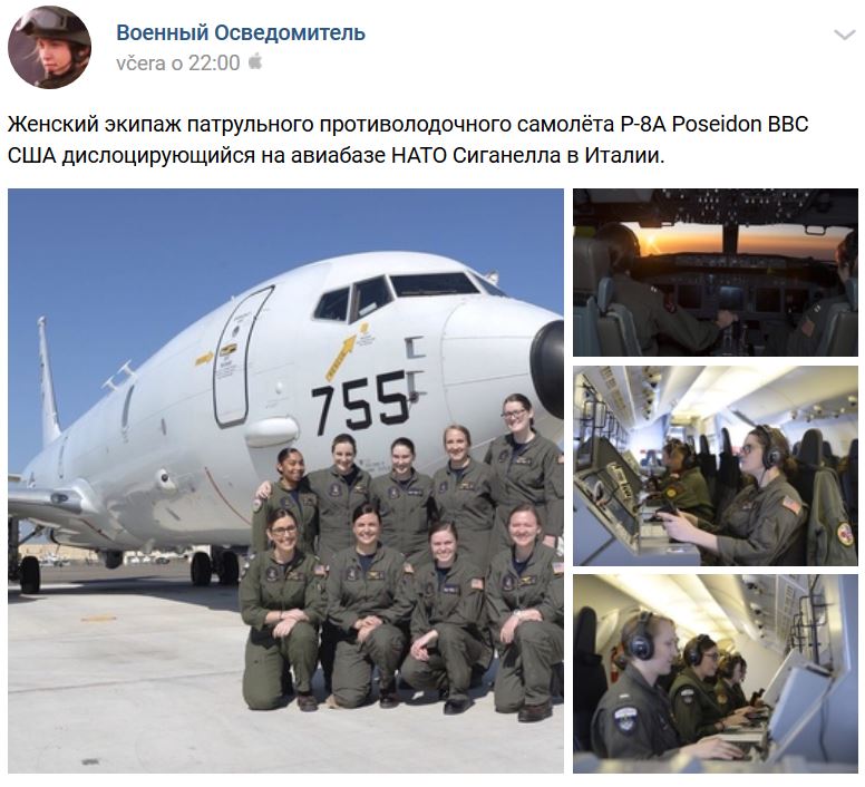 US NAVY hliadkové protiponorkové lietadlo P-8A Poseidon v Taliansku na Sicílii, námorná letecká základňa Sigonella odkiaľ štartujú lietadlá na monitorovanie Stredozemného mora + Sýrskeho pobrežia, kompletná 9-členná ženská posádka lietadla 755: