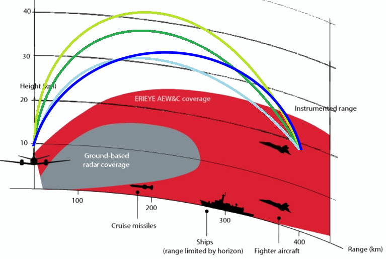 Čo je tiež vidieť - útočiace rakety už na relatívne veľkej diaľke 350+ km vylietajú zo zony pokrytia (švédsky systém Erieye) - a to zrejme ešte na svojom aktívnom úseku dráhy, čo robí predpoveď ďalšej možnej dráhy "komplikovanou". Pokiaľ ju teda vôbec zaregistruje - strela bude mať, už vzhľadom na určenie, nízke RCS, povedzme na úrovni protizemných striel s plochou dráhou letu (a teda dosah AWACS bude zhruba polovičný ako na typické vzdušné ciele). nemám lepší editor kriviek