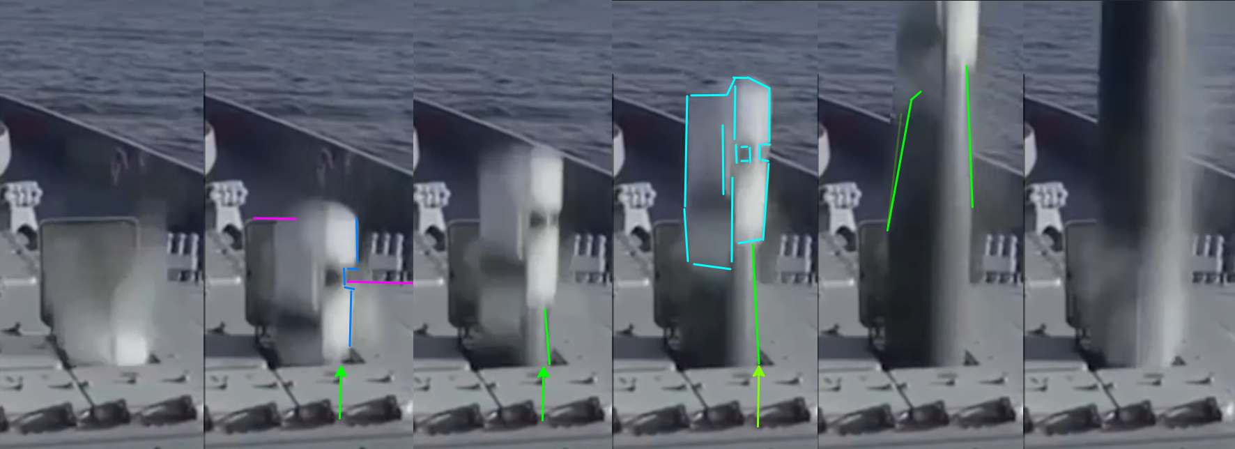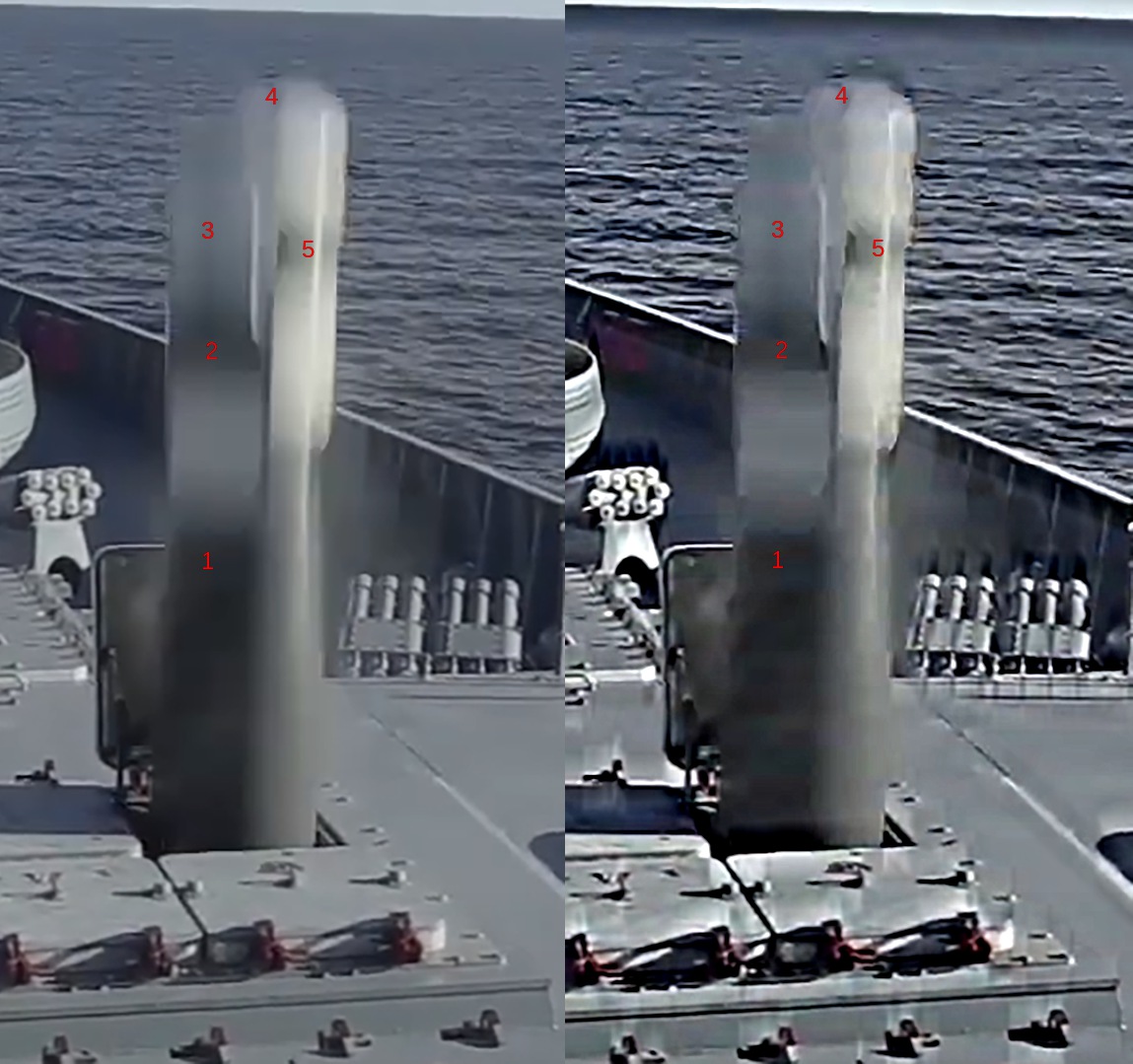 Už jsem na to přišel, kde je sání vzduchu do scramjetu a jakou to má konstrukci na Zirkonu.. dejte mi půl hodiny, zatím jen přihodím fotku zas protaženou filtrem na doostření pohybového směrového rozmazání, všimněte si, že ten bílý materiál je i někde jinde než jen na "špici" (i když na té odvrácené straně je ho teda mrtě) a důvod proč tam je souvisí s tím, co tu píšu, že jde o nějaký ablativní materiál a aerodynamické zaslepení sacího ústrojí scramjet komory a lamače rázové vlny (a dalšího zařízení tam, kde je ho opravdu hodně) dokud je střela urychlovaná jen pomocí raketového motoru na TPH na minimální rychlost M4 (což se uvádí jako minimální rychlost pro zážeh scramjet motoru) a jelikož je to prudké zrychlení v řádu desítek G, tak aerodynamický ohřev není pozvolný, ale defakto raketový v této fázi letu a tomu brání tím bílým materiálem, který se pravděpodobně začne rychle odpařovat až v řídkých vrstvách atmosféry a velkých výškách (+10km minimálně) po dosažení letové rychlosti střely M4-5-6 za pomoci raketového motoru.