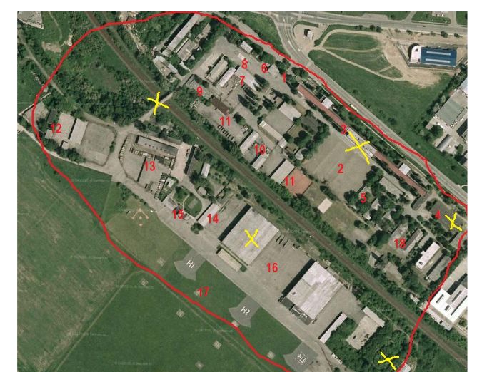 (11) a (13) uloženie NZ techniky, (7) autopark prevádzkovej techniky, (9) kinosál, v budove (6) a v budove za ňou, nad (8) boli kancelárie "služieb", okrem iného NSRDV a kontráši. Budovy bez označenia uplne hore - vojenská "slobodárka"