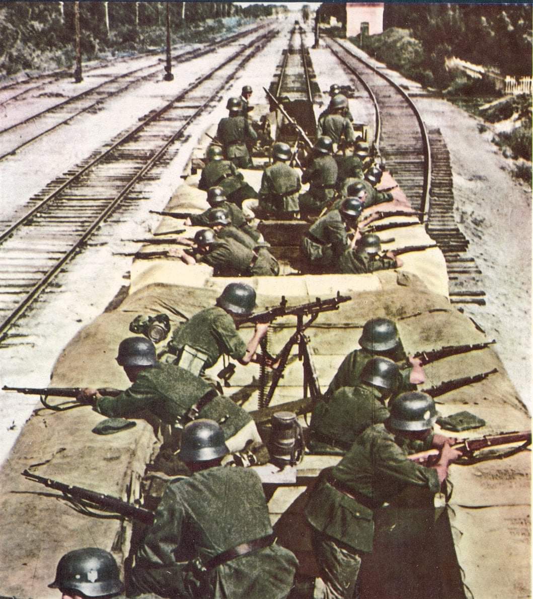 Polsko (září 1939) Němečtí vojáci na palubě obrněného vlaku na cestě do města Lodž.