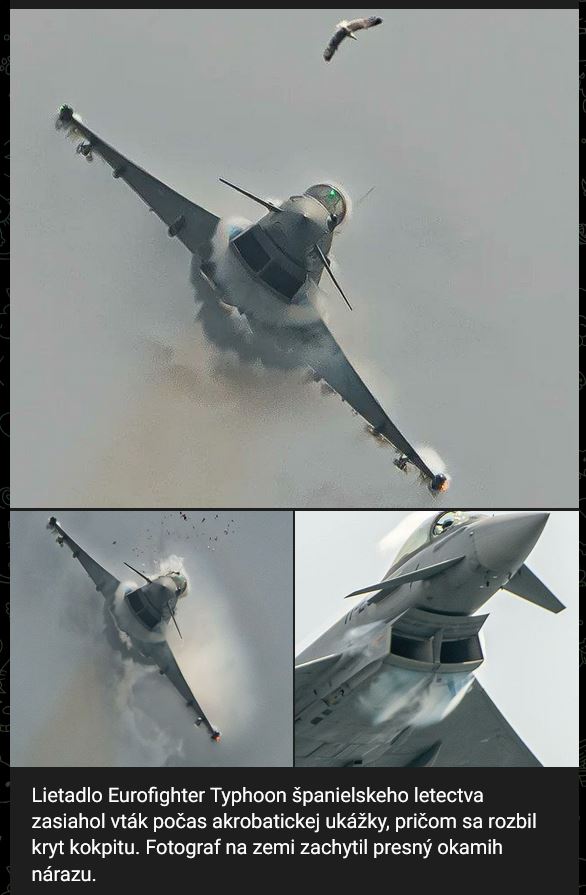 Lietadlo Eurofighter Typhoon španielskeho letectva zasiahol vták počas akrobatickej ukážky, pričom sa rozbil kryt kokpitu. Fotograf na zemi zachytil presný okamih nárazu.