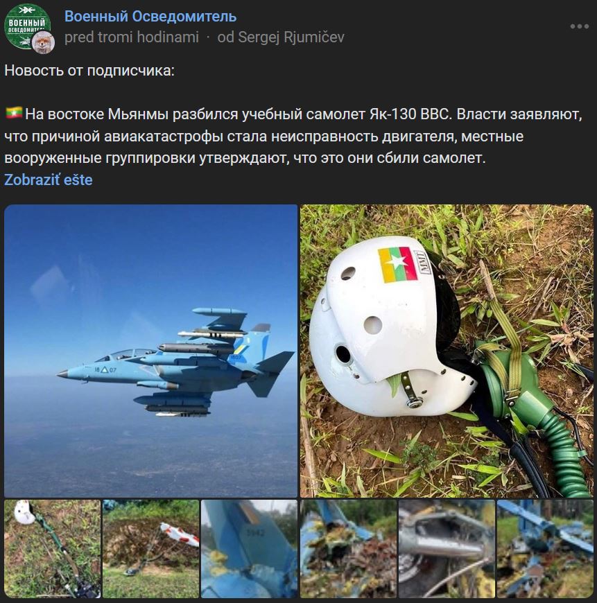 Sobota 11.11.2023 cca 16 hod miestneho času, Mjanmarsko (Barma), havária / zostrel cvičného lietadla Hongdu K-8W Karakorum, registračné číslo 3942 pri hranici s Thajskom kde pôsobia "rebeli". Lietadlo sa zrútilo po tom, ako ju zostrelili v obci Hpruso v Karenskom štáte. Obaja piloti sa katapultovali, ale neboli nájdení. Zdroj https://vk.com/wall-123538639_3919651 z 12.11.2023 = tu nesprávne identifikuje lietadlo ako Jak-130, viď kormidlovka