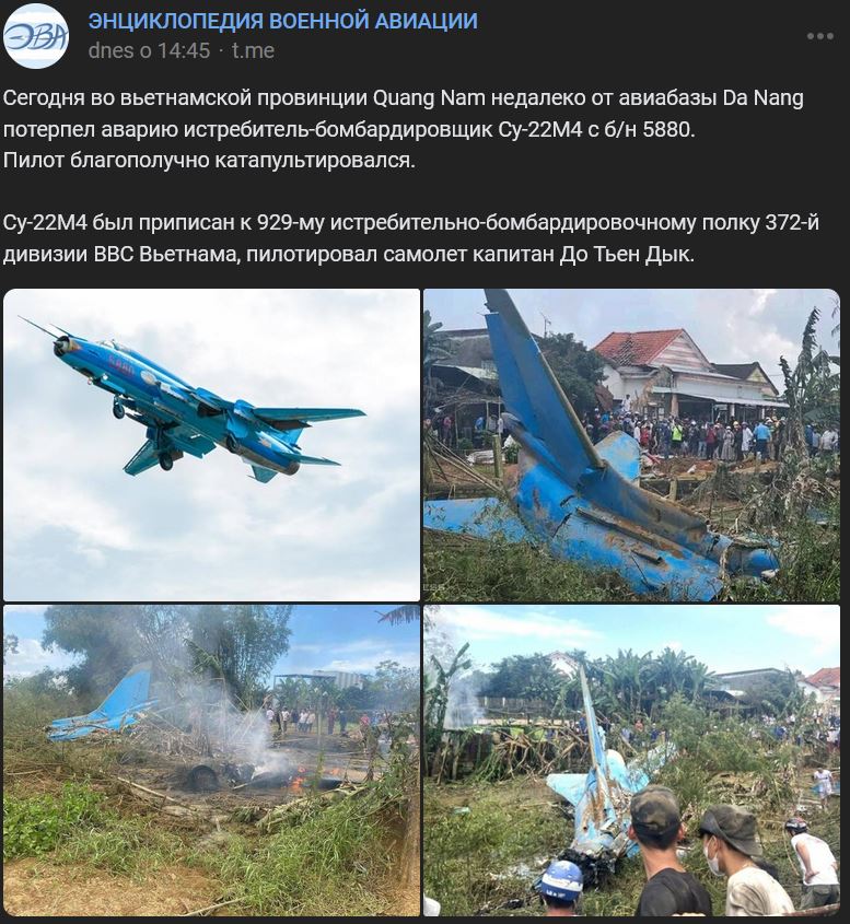 Utorok 09.01.2024 cca 11:15 hod. miestneho času, Vietnam, provincia Quang Nam neďaleko leteckej základne Da Nang sa po technickej poruche zrútil stíhací bombardér Suchoj Su-22M4 (Су-22М4) trupové číslo 5880. Pilot sa bezpečne katapultoval, lietadlo je zničené. Su-22M4 bol pridelený k 929. stíhaciemu bombardovaciemu pluku 372. divízie vietnamských vzdušných síl a pilotoval ho kapitán Do Tien Duc.
