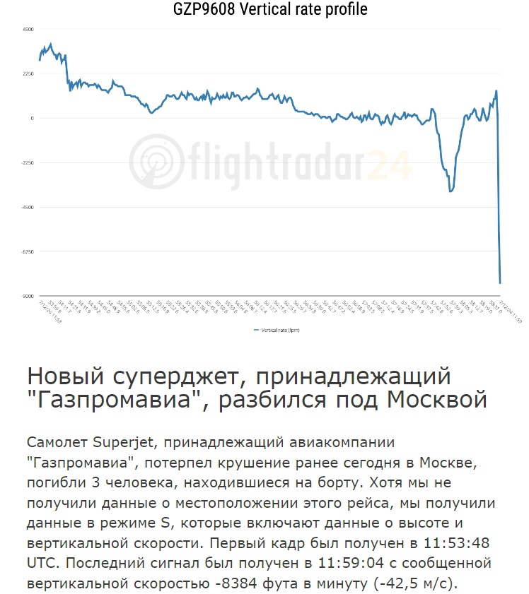 doprava-doľava) tiež 25°. V 6 minúte letu pri rýchlosti 320 uzlov (fungovala zvuková signalizácia OVERSPEED) lietadlo prešlo na klesanie so zvýšením uhla náklonu na stúpanie (пикирование). V priebehu klesania bolo zaznamenané vypnutie autopilota a ťahového automatu. Pilotom sa nepodarilo zastaviť klesanie úplným vychýlením páky riadenia k sebe. Zaznamenalo sa tiež, že pred vzletom bol zapnutý regulátor ťahu a autopilot bol zapnutý počas vzletu vo výške 550 stôp. V 5 minúte letu lietadlo prešlo z takmer horizontálneho letu vo výške 5160 stôp (hodnoty uhla náklonu boli 5°-6° a hodnoty uhla nábehu 10°-11°) do klesania s uhlom náklonu do 4° až do stúpania. V okamihu prechodu do klesania bola prístrojová rýchlosť 200 uzlov a zvyšovala sa, došlo k synchronizovanému zasunutiu klapiek do úplne zasunutej polohy.