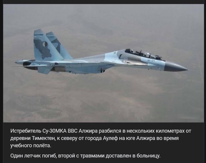Lietadlo Suchoj Su-30MKA (Су-30МКА) VVS Alžírska sa zrútilo niekoľko kilometrov od dediny Timekten severne od mesta Aoulef na juhu Alžírska počas cvičného letu. Jeden pilot zahynul, druhý bol so zraneniami prevezený do nemocnice
