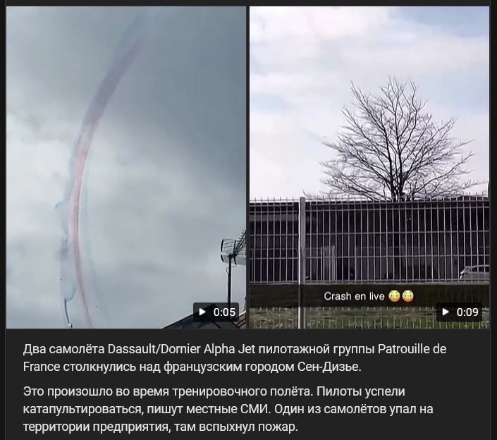 2 lietadlá Dassault/Dornier Alpha Jet akrobatického tímu Patrouille de France sa zrazili nad francúzskym mestom Saint-Dizier. Stalo sa to počas cvičného letu. Pilotom sa podarilo katapultovať, napísali miestne médiá. Jedno z lietadiel sa zrútilo na územie podniku, vypukol tam požiar