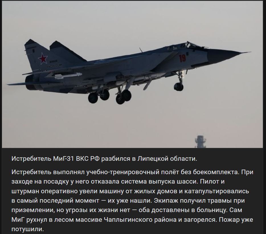 Zdroj https://vk.com/wall-173678697_417763 z 10.10.2025Lietadlo vykonávalo výcvikový let bez bojovej výzbroje. Pri pristátí jej zlyhal systém vysúvania podvozku. Pilot a navigátor rýchlo odleteli od obytných domov a v poslednej chvíli sa katapultovali – už ich našli. Posádka utrpela pri katapultovaní a dosadnutí na zem zranenia, ale ich životy nie sú ohrozené – obaja boli prevezení do nemocnice. Samotný MiG sa zrútil v lesnom poraste v Čaplyginskogo rajóna (Чаплыгинского района) a začal horieť. Požiar už bol uhasený.