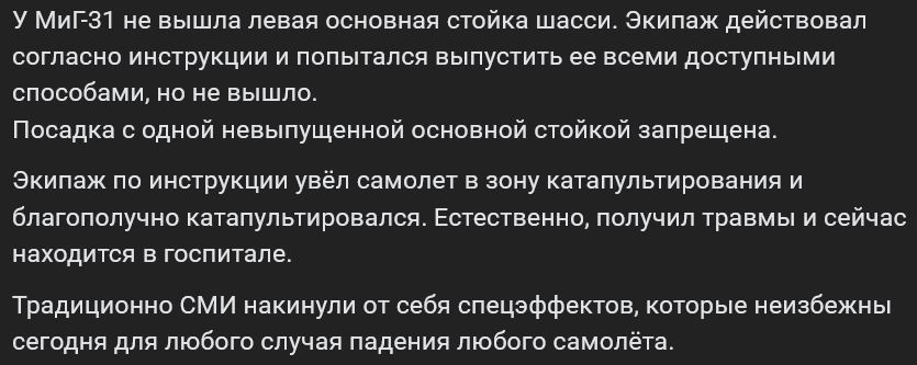 Zdroj https://vk.com/wall-182816816_92016 z 10.10.2025U MiG-31 sa nesunula ľavá hlavná podvozková noha. Posádka konala podľa pokynov a pokúsila sa ho vysunúť všetkými dostupnými spôsobmi, ale nepodarilo sa to.