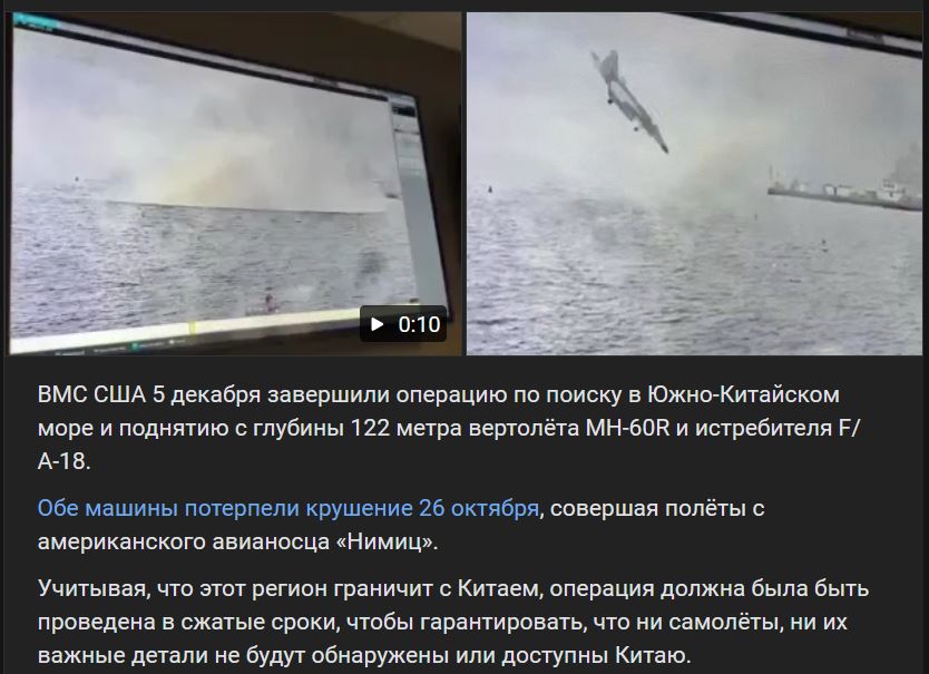 VMS SŠA v piatok 05.12.2025 ukončilo operáciu pátrania v Juhočínskom mori a vyzdvihnutia vrtuľníka MH-60R a lietadla F/A-18 z hĺbky 122 metrov.