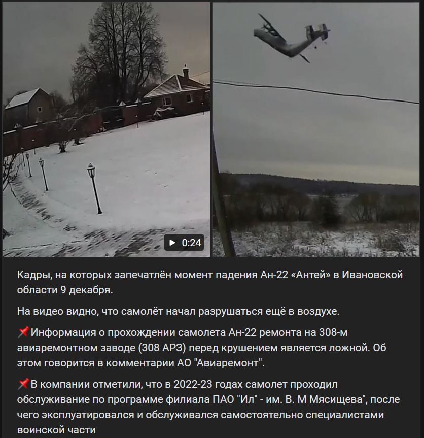 Zábery, na ktorých je zachytený moment pádu lietadla Antonov An-22 „Antej“ (Ан-22 Антей) v Ivanovskej oblasti v utorok 09.12.2025