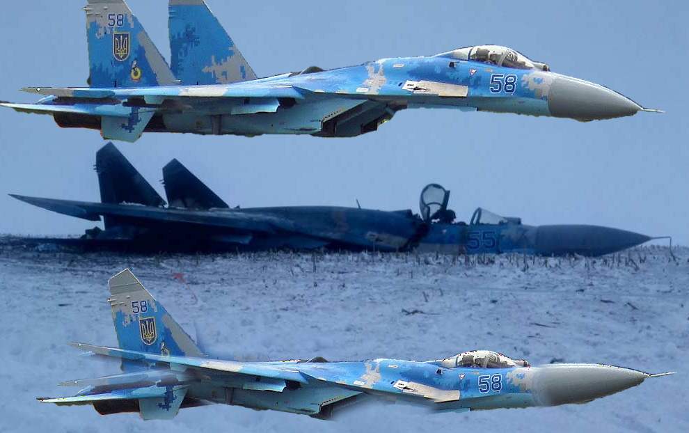 ukrajinský Su-27 modrá 55 - bol "najnovší" vo výzbroji ukrajinskej armády, mal nálet 479 hodín, 824 pristátí To vpredu vyzerá ako vytrhnuté motory....