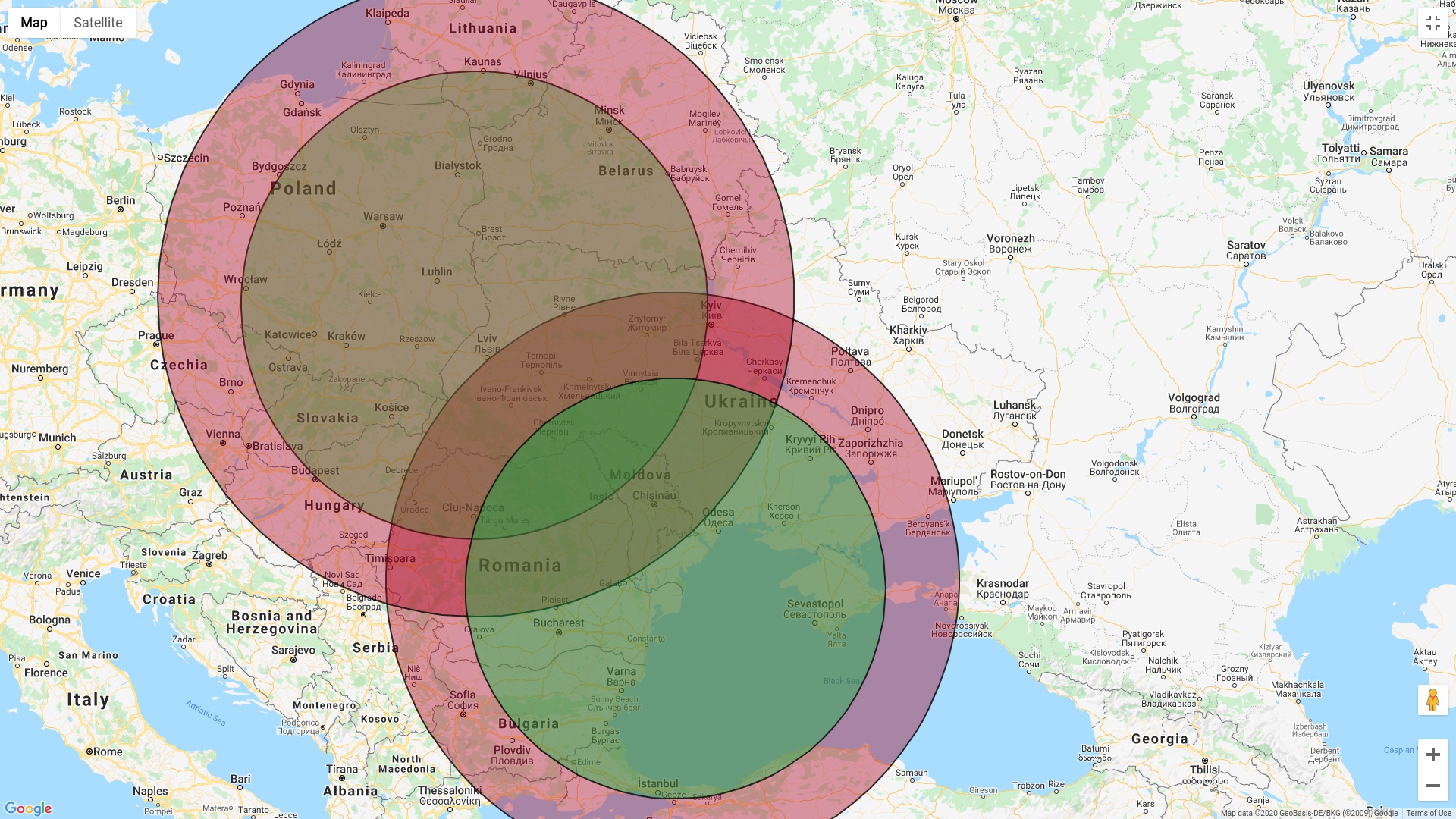 A takto měli ty dva E-3A dosahy z operační výšky 10km a co nejbližší kroužení u hranice s UA v Polsku (v tom výběžku nad Lvovem) a když píšou v Rumunsku nad územím, tak zde krouží úplně v tom výběžku na severovýchodě - teoreticky to ještě můžete posunout trochu nad moře do výsostných vod v hlavě - ale to na situaci nic nemění, červené to je 650km maximální teoretický dosah radaru na velké letouny letící na velkých výškách > 10km, zelené to je 477km a znázorněné odkud až mohli čistě teoreticky zachytit nějaký emitor EM záření (pak už byl pro ně za rádiovým horizontem) - typu přehledový radar PVO umístěný nadmořské výšce 250m, což je nadmořská výška oblasti u Snižného, ale to je celkem jedno, ten rozdíl je jen pár km jestli 0 či 250m.