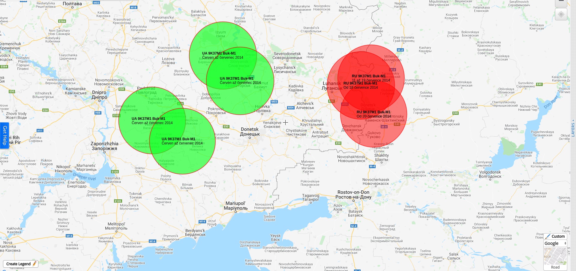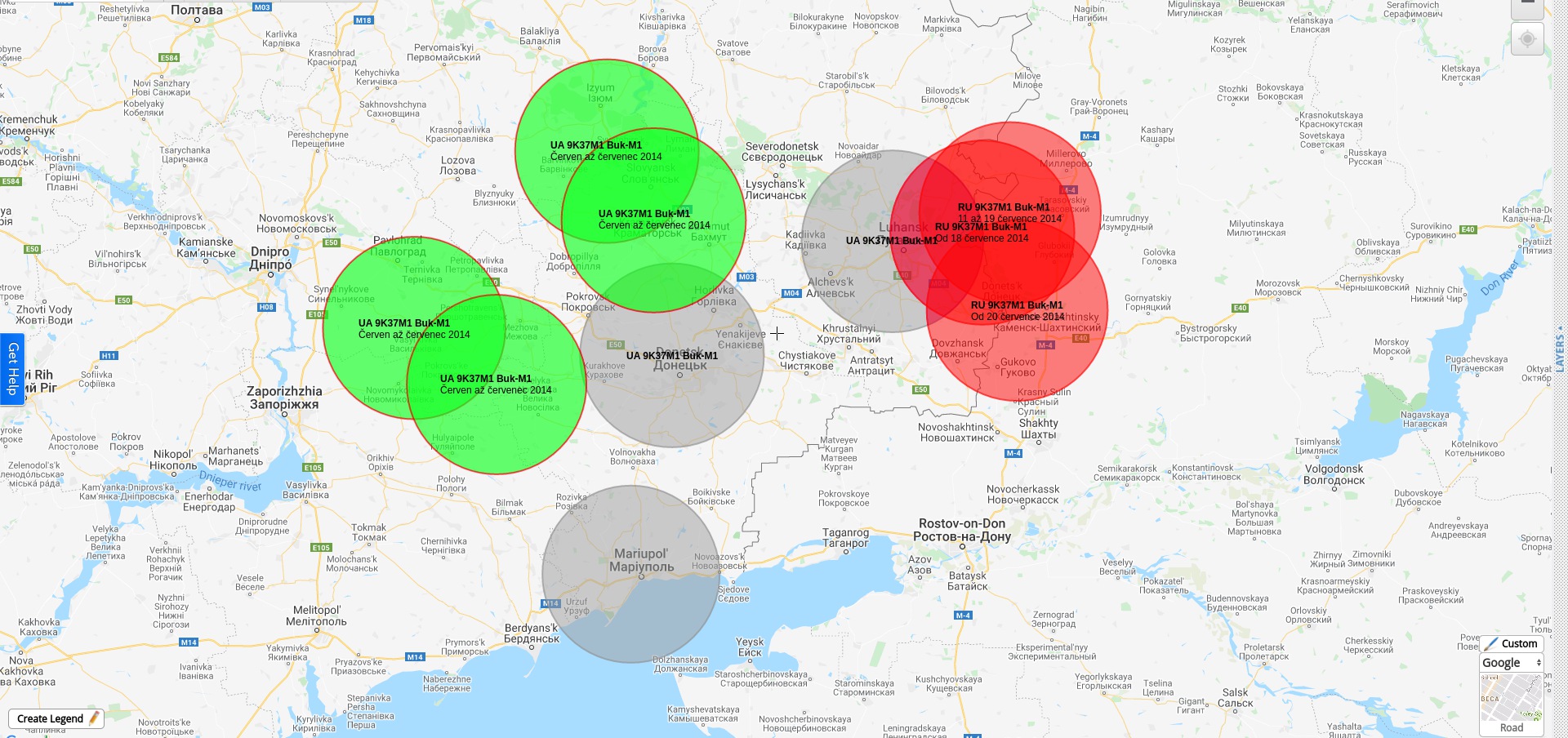 Překreslené (přesně na uvedené souřadnice) rozmístěných 9K37M1 Buk-M1 (a zóny poražení cíle o poloměru 45km - zajímavé je, že JIT tam má uveden dosah 42km v těchto dokumentech) v r.2014 červen-červenec - z uniklého JIT dokumentu. Zelené = UA, Červené = RF.