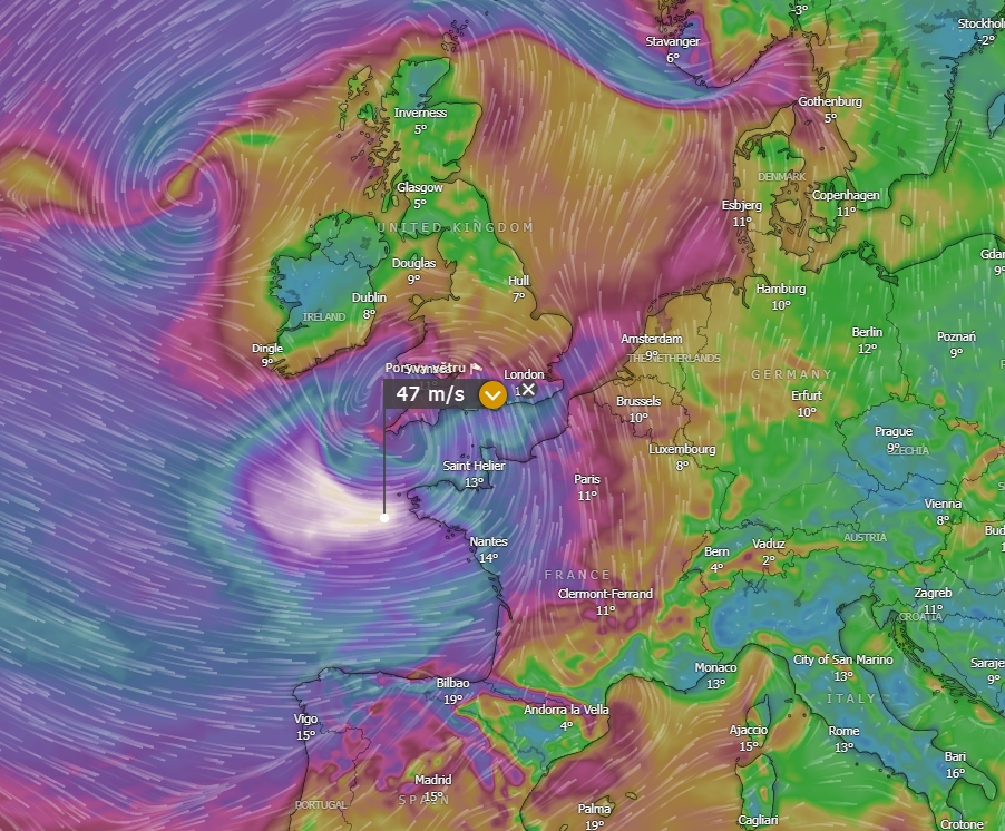 Proč? Protože VLNY. A pokud je na volném moři vlna 12m, na pobřeží to bude masakr. Chráněný bazén v Brestu bude mít co dělat, aby ty vlny ustál a nepustil je dále - podle předpovědi 8+ m. No uvidíme, nezávidím jim to...